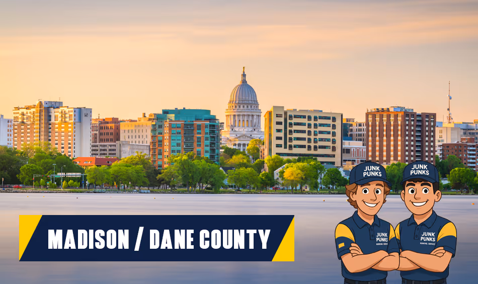 At Junk Punks, we believe junk removal should be simple, transparent, and stress-free. Our Madison crew covers Dane County, including Madison, Middleton, Sun Prairie, Verona, Fitchburg, Stoughton, Oregon, McFarland, Cottage Grove, DeForest, Waunakee, and Cambridge. Whether it’s a single item or a full home clean-out, we show up on time, work hard, and leave your space spotless—every time.